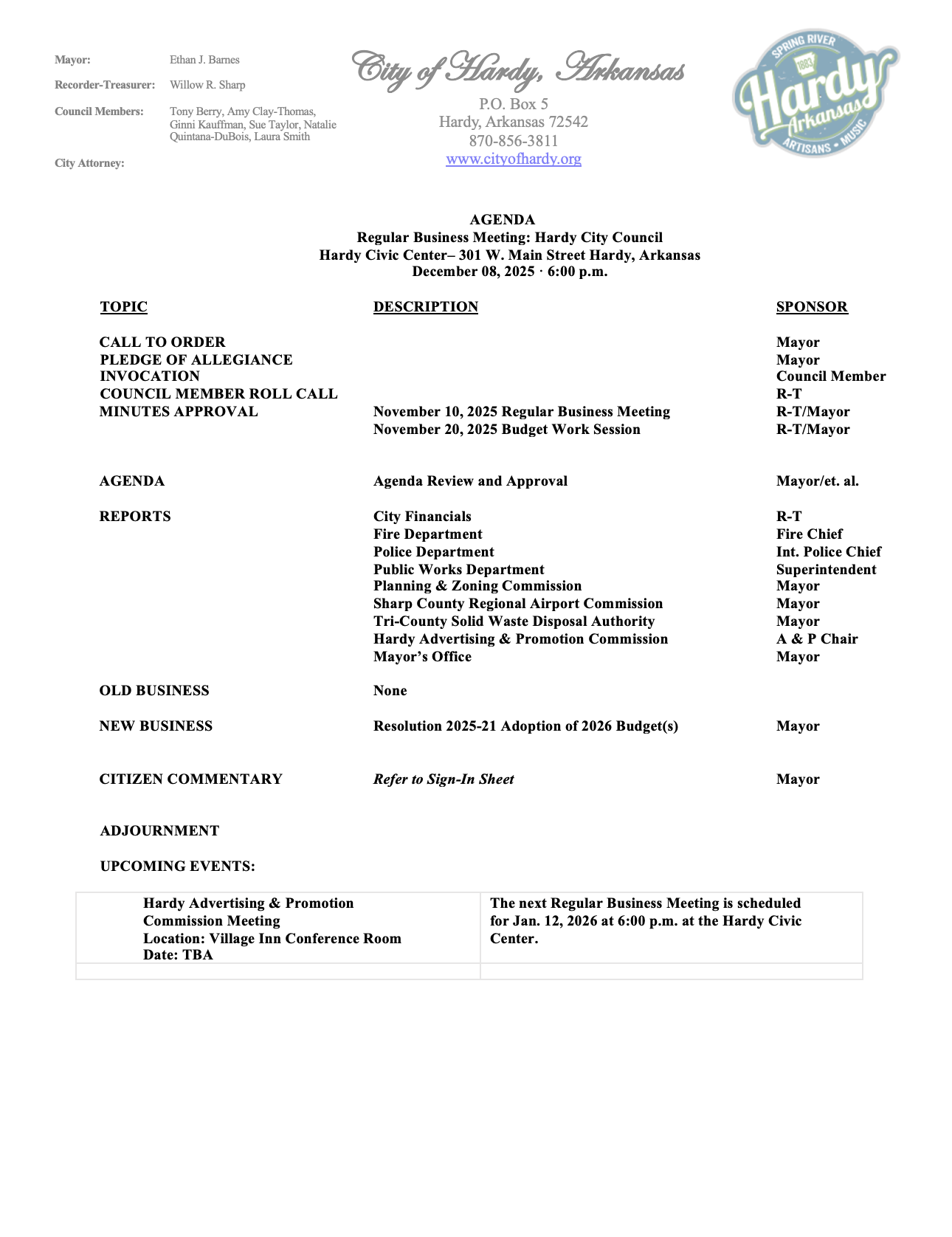 2025-12-08 Regular Business Meeting Agenda